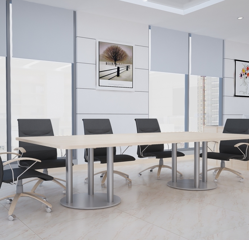 The Astra collection from Special-T includes professional conference room tables made in the USA. Even at first glance Astra tables will grab your attention with contemporary metal bases and designer laminate surfaces. Astra tables are available in extensive sizes, shapes, and finishes to meet the needs of any space. 3" diameter columns ensure both the quality and stability you'd expect from office furniture manufactured in the United States. Once you've selected your Astra conference table size, finish, and shape, be sure to inquire about awesome power modules to further improve performance.