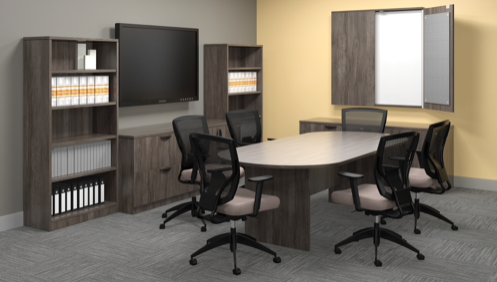 Moving to the boardroom, popular Superior Laminate tables like the SL9544RS are ready to help you lay the foundation for a modernized space. While modern by design, Artisan Grey tables remain practical and professional. This 95" long racetrack table can be complimented to perfection with matching presentation boards, bookcases, and wall cabinets.