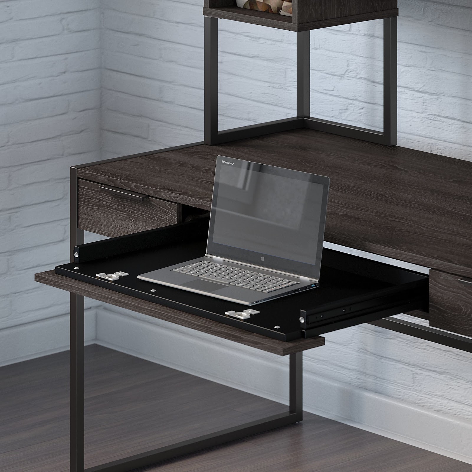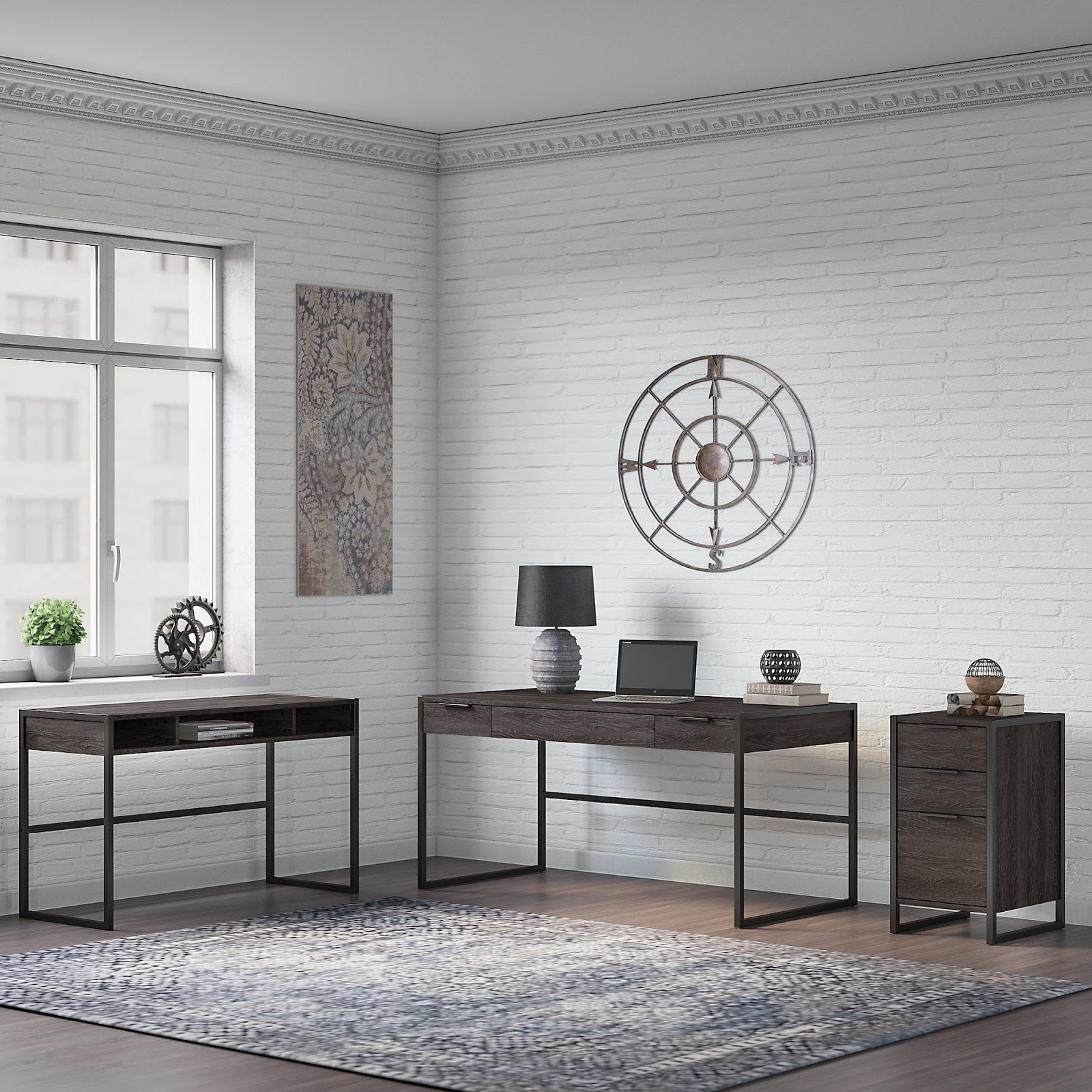 The first thing you'll notice when checking out the kathy ireland Atria collection is the blend of modern-industrial design characteristics. This all new desk collection offers Charcoal Gray laminate operating surfaces that pair with metal accents to create one of the most unique home furniture lines on the market today.